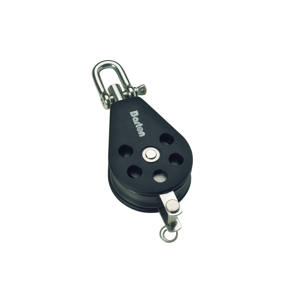 Bozzello singolo girevole con arricavo, diam. cima mm. 8, max carico di lavoro kg. 370 carico di rottura kg. 740, dimensioni puleggia mm.35 lunghezza mm.97
