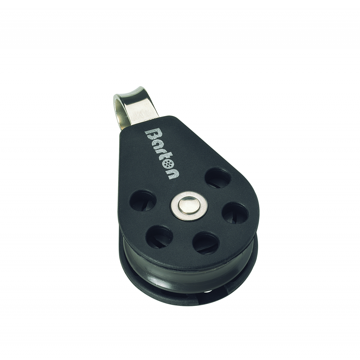 Bozzello singolo con occhio fisso, diametro cima mm. 8, max carico di lavoro kg. 350 carico di rottura kg. 700, dimensioni puleggia mm. 30 lunghezza mm. 70