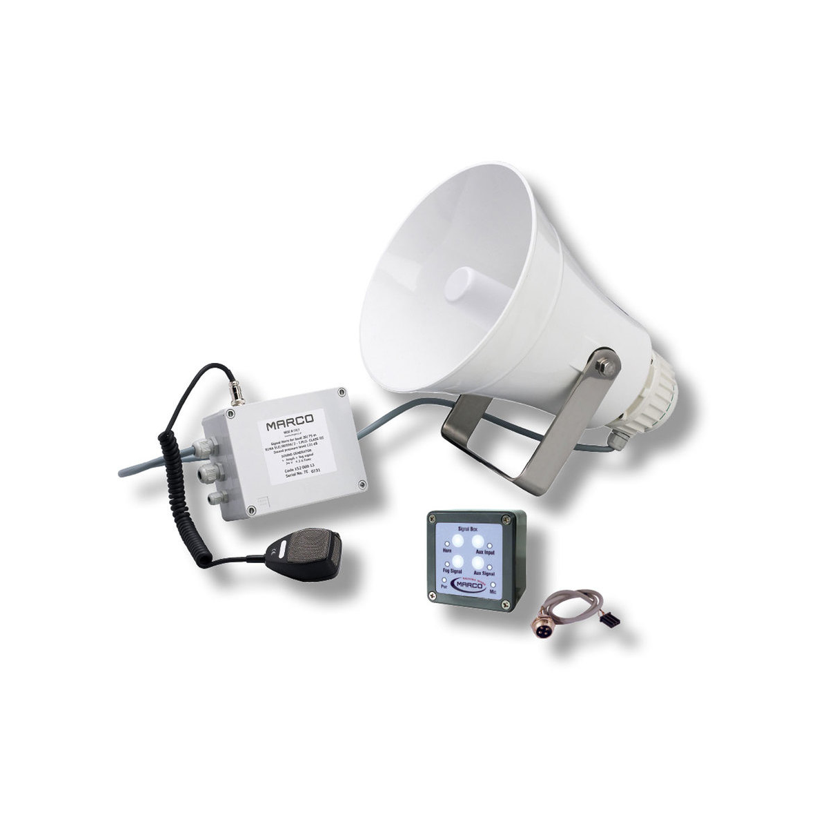 Tromba elettronica omologata R.I.Na. n. ELE/556806CS/1 e LLOYD’S REGISTER MCA Bureau Veritas e NMMA in accordo alle norme internazionali COLREG 72 IMO classe III, obbligatoria per tutte le imbarcazioni mercantili e turistiche da 20 a 75 mt., con amplificatore di voce e segnale automatico di nebbia. Livello sonoro 131 dB. Alimentazione 24V., consumo 4 Ah. Peso kg. 6,1.
