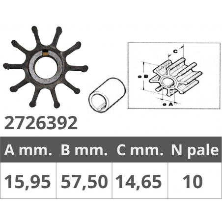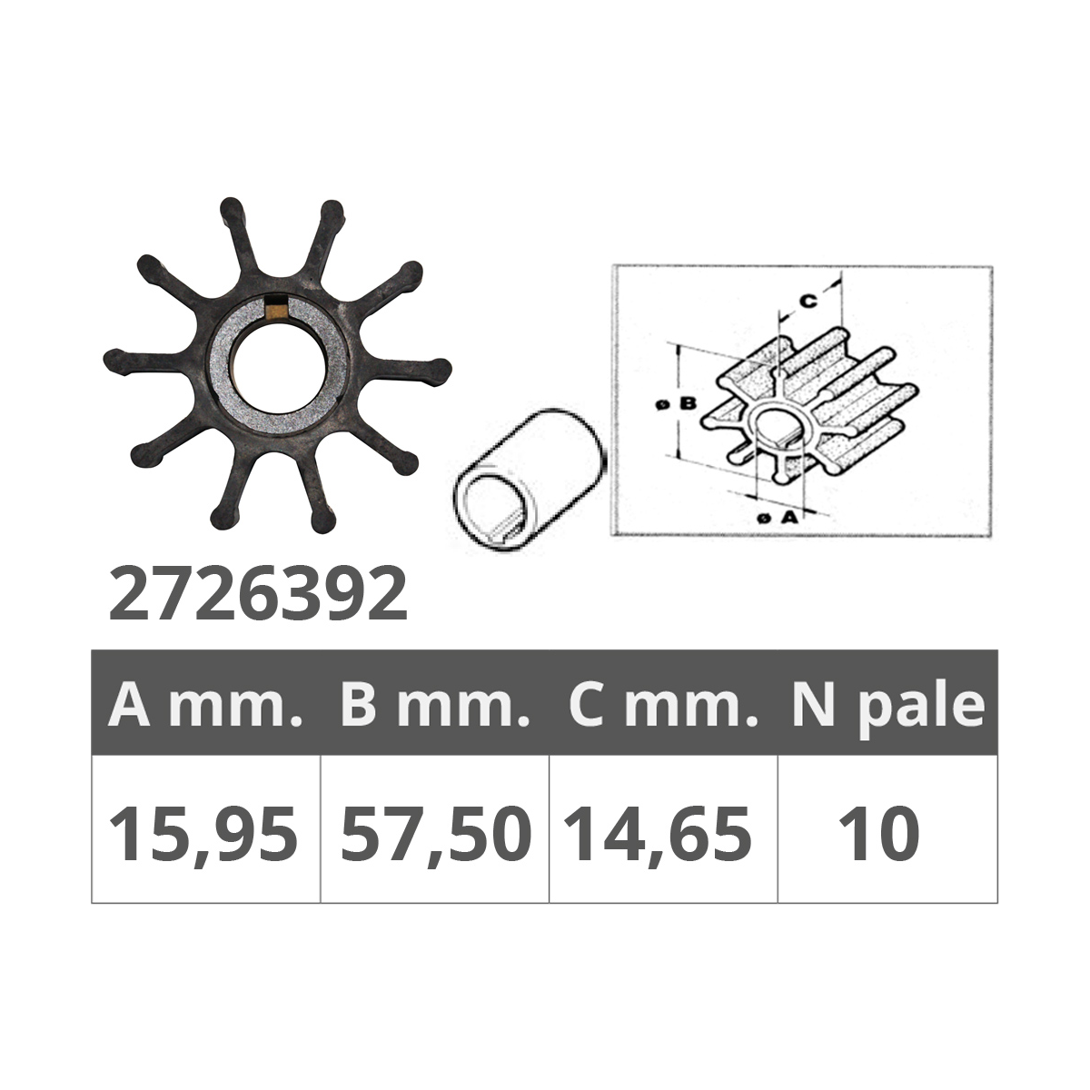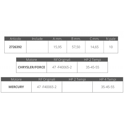 Girante per motori Mercury-Chrysler Force 4T 35-45-55 hp dim. diam. int.mm.15.95 diam. est.mm.57.5 spessore mm. 14.65, nr.10 pale