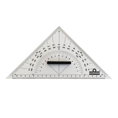 - due squadrette nautiche in plexiglas trasparente con maniglia. Doppio goniometro incorporato e gradazione in millimetri, lungh. Ipotenusa mm. 250 rif. 0101600