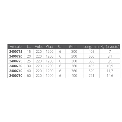 in materiale composito e serbatoio in acciaio inox AISI 316. Selle e fasce in acciaio inox, incluse di serie. Raccorderia in uscita da 1/2 pollice. Alimentazione 220V, consumo 1200 watt, pressione max 6 bar, dimensioni mm. diametro 400 X 721, peso KG. 14,