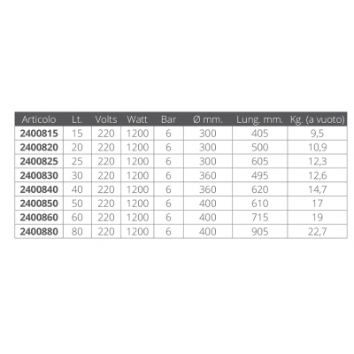 in acciaio inox AISI 304 con serbatoio in acciaio inox AISI 316. Selle e fasce in acciaio inox, incluse di serie. Raccorderia in uscita da 1/2 pollice. Alimentazione 220V, consumo 1200 watt, pressione max 6 bar, dimensioni mm. diametro 300 X 605, peso KG. 12, 3