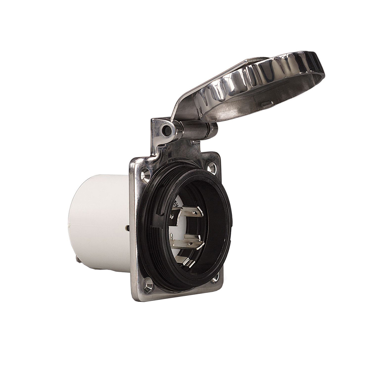 Spina ad incasso in acciaio inox AISI 316 con sistema Easy Lock. Tappo Soft Touch che rimane aperto durante il collegamento, stagna e con blocco di chiusura. Protezione posteriore con sfiato.