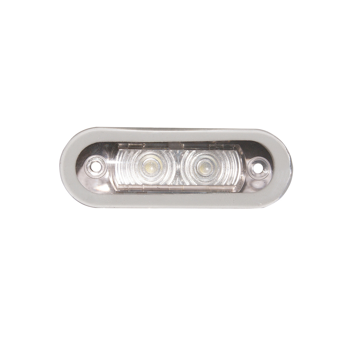 Luce di cortesia stagna a 2 LED in policarbonato trasparente, per illuminazione pozzetti, locali motore, ripostigli, ecc... 2 fori di fissaggio. Dim. lung. mm. 82 x 28 h. 12V.